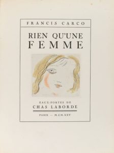 1925. LIVRE : (BIBLIOPHILIE-SICALYPTIQUE). CARCO, FRANCIS : RIEN QU'UNE FEMME : Paris : Imp. Coulouma, 1925. 4º m. 162 p. + 1 h. Illustré de 15 gravures hors texte de Chas Laborde. Broché. Édition numérotée de 276 exemplaires. Traduit automatiquement par DeepL. Seule la version originale fait foi.