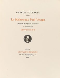 1926. LIVRE : (BIBLIOPHILIE-SICALYPTIQUE). SOULANGES, GABRIEL : LE MALHEUREUX PETIT VOYAGE. Paris : L'Estampe Moderne, 1926. 8º mayor. 207 p. + 1 h. Illustr. avec des coiffes et des culs-de-lampe, coloriés à la main, par Brunelleschi. Quelques points de rouille. Broché original illustré, édition numérotée de 474 exemplaires. Traduit automatiquement par DeepL. Seule la version originale fait foi.
