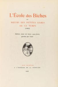 1928. LIVRE : (BIBLIOPHILIE-SICALYPTIQUE). L'ÉCOLE DES BICHES OU MŒURS DES PETITES DAMES DE CE TEMPS (1863). Acacias : à l'enseigne de la Crinoline, 1928. 4º mineur. 164 p. + 1 h. Illustré de 13 eaux-fortes (dont une détachée) et d'un frontispice gravé par Viset (Luc Lafnet). Enc. dans le livre de poche de l'éditeur. Édition numérotée de 350 exemplaires. Traduit automatiquement par DeepL. Seule la version originale fait foi.