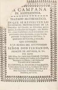 1726. LIVRE : (SCIENCE). BALBASOR, F : [L]A CAMPANA DE MANFREDONIA. TRAITÉ DE MATHÉMATIQUES. Séville : Imp. Blas de Quesada, 1726. 8º maire. 36 h. + 135 p + 3 h. Frontispice gravé. 1 gravure dans le texte. 4 planches pliées. Restauration dans le coin des 36 premières h. avec de petites pertes de texte. Enc. en demi-vélin, tejuelo. Écrit par le Colonel Francisco Balbasor. Il a été commandant général de l'artillerie de l'armée et directeur de l'Académie royale de mathématiques de Cadix. Traité de mathématiques, dans lequel sont résolues les inconnues de la dimension du cercle. Nous mettons en évidence le dernier problème mathématique qui résout la quadrature du cercle. Palau 22290. Traduit automatiquement par DeepL. Seule la version originale fait foi.