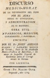 1785. LIVRE : (MÉDECINE-MORALE). VIADER I PAYRACHS, JOSEF ANTONIO : DISCURSO MEDICO-MORAL DE LA FORMACION DEL FETO POR EL ALMA DESDE SU CONCEPCION, Y ADMINISTRACION DE SU BAUTISMO OBRA UTIL A PARROCOS, MEDICOS, COMADRONES I PARTERAS. Gérone : Imp. Narciso Oliva, 1785. 8 º mineur. 12 h. + 240 p. Taches de rouille. Enc. sur parchemin. Traduit automatiquement par DeepL. Seule la version originale fait foi.