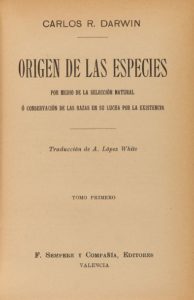 1900 ca. LIVRE : (HISTOIRE NATURELLE). DARWIN, CARLOS R. : ORIGINE DES ESPÈCES. PAR LA SÉLECTION NATURELLE OU LA CONSERVATION DES RACES DANS LEUR LUTTE POUR L'EXISTENCE. Trad. A. López White. Valencia : Sampere y Compañía Ed., s.a. 3 vol. in 8º. I : 235 p. + 2 h. II : 232 p. + 3 h. III : 296 p. + 4 h. Trois volumes enc. en demi-cuir. Traduit automatiquement par DeepL. Seule la version originale fait foi.