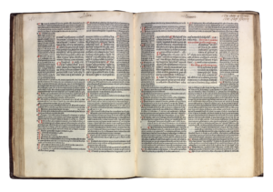 Admirable impression gothique en rouge et noir, sur deux colonnes, avec la glose en petit corps encadrant le texte canonique. Les pièces liminaires comprennent deux tableaux typographiques à pleine page, dont un arbre de consanguinité imprimé en rouge et noir, et au dernier feuillet, le colophon et la marque typographique gravée sur bois sont tous deux tirés en rouge.