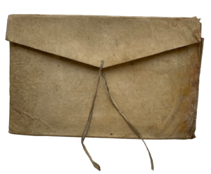 [BUGEY] — Portefeuille du XVIIIe siècle en vélin et carton à soufflet, avec rabat à lanières (34 x 22 cm).