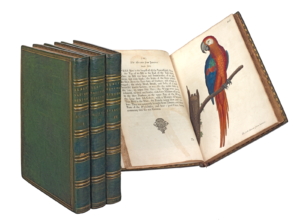 Ce grand livre d’ornithologie est recherché pour les 306 planches d’oiseaux qui l’illustrent, gravées à l’eau-forte d’après les dessins de l’auteur et de sa fille Elizabeth Albin et mises en couleurs à la main par leurs soins.