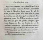 Édition originale rare de cet ouvrage très complet sur l'art de préparer les odeurs, essences, parfums, aromates, eaux de senteur, poudres, pommades, huiles, pâtes, lait virginal, cosmétiques, vinaigres de propreté, savons et savonnettes, pastilles odorantes, fumigations, bains aromatiques, gants parfumés, rouge de toutes qualités, ainsi que la recette la plus moderne pour la composition de l'eau de Cologne.