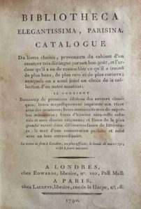 Le catalogue comprend 637 numéros extraits de la bibliothèque Antoine-Marie Pâris d'Illins (1746-1809), qui avait fait passer ses livres en Angleterre avant d'y émigrer lui-même, mais aussi un choix d’incunables précieux provenant du cardinal Loménie de Brienne.
