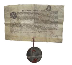 Ce diplôme universitaire, rédigé en latin et imprimé sur peau de vélin, est probablement celui de Jean-Baptiste-Charles Dugas de La Catonnière (1726-1821), mousquetaire du roi, gouverneur de Rive-de-Gier, titré baron héréditaire sous la Restauration.