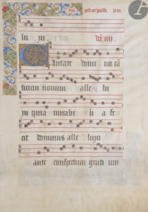 En latin, écriture gothique liturgique, musique notée sur des portées de 4 lignes tracées à l’encre rouge, notation carrée, grandes initiales ornées (recto et verso), bordures enluminées sur deux côtés sur fonds réservé et or bruni avec décor d’acanthes colorées et fleurs.