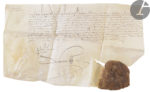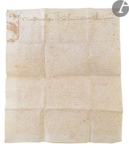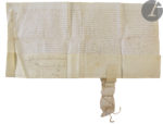 En français, acte sur parchemin, beau sceau à sec armorié.