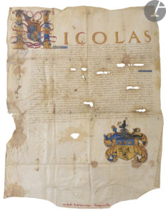 Fort bel acte copié en italique, précédé d’une grande initiale armoriée enluminée aux armes de Nicolas de Lorraine (1524-1577), fils d’Antoine le Bon, duc de Lorraine et de Bar, et de Renée de Bourbon-Montpensier, d’abord évêque de Metz de 1543 à 1548 et de Verdun de 1544 à 1547, puis comte de Vaudémont de 1548 à 1577, seigneur de Mercœur de 1563 à 1569, puis duc de Mercœur de 1569 à 1577 : il sera régent des duchés de Lorraine et de Bar pendant la minorité de son neveu Charles III de 1552 à 1559. Il est le père de Louise de Lorraine-Vaudémont, épouse du roi de France Henri III.