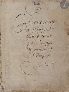 [DIPLOMATIE]. — [HENRI IV]. — [LOUIS XIII]. — Conference secrette de Henry le Grand tenue pour le sujet de parvenir à l’Empire ; Traicté de ligue projettée Entre sa Saincteté, le Roy, Mr de Savoye, Venise & Mantoue ; [GODEFROY Théodore]....