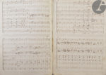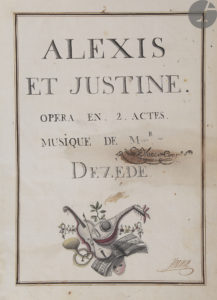Belle copie manuscrite, conservée dans son cartonnage d’origine, de la première partition imprimée de l’opéra-comique Alexis et Justine, écrit par Boutet de Monvel et mis en musique par Dézède, surnommé l’Orphée des champs. Cette partition a figuré dans la petite bibliothèque musicale rassemblée par le célèbre peintre Claude Joseph Vernet (1714-1789), mélomane averti et proche des compositeurs de son temps.