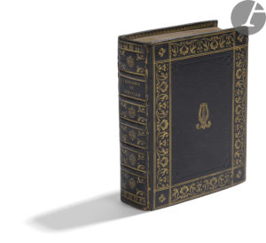 Reliure du XIXe siècle de maroquin bleu nuit à grain long. Large encadrement composé de fleurettes et de rinceaux dorés, lyre dorée au centre, dos orné de lyres et de rinceaux dorés, roulette intérieure dorée, tranches dorées, deux premiers feuillets montés sur onglet.