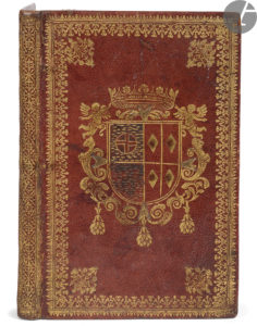 Maroquin rouge, dentelle droite dorée en encadrement, fleuron doré aux angles et armes dorées au centre sur les plats, dos lisse richement orné, tranches dorées (Atelier Andreoli).