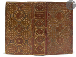 Exemplaire dans une étonnante reliure sur les plats et le dos de laquelle a été dessiné et peint un décor à compartiments type fanfare. Il est tout à fait vraisemblable que ce décor ait été réalisé par un amateur à une époque postérieure à la reliure. La qualité de cette dernière et la finesse de la roulette dorée sur les chasses, nous paraissent en effet en décalage avec le décor qui couvre les plats et le dos, qui semble d’une réalisation peu académique.