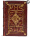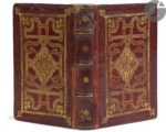 Maroquin rouge, plats ornés d’un fleuron doré central inscrit dans un décor d’entrelacs géométriques peints avec fleur de lys dorée aux angles, le tout encadré d’une roulette à chainettes dorées avec fleur de lys dorée aux angles, et de filets à froid, dos à nerfs orné, tranches dorées (reliure de la première moitié du XVIe siècle).