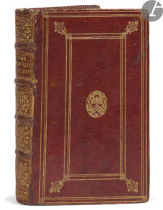 Maroquin rouge, plats décorés à la Du Seuil, armes dorées au centre, dos à nerfs richement orné, roulette dorée intérieure, tranches dorées, étui (reliure de l’époque, étui du XXe siècle).