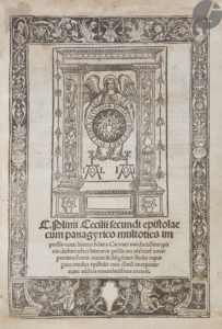 Édition milanaise rare réunissant les Lettres et le Panégyrique de Trajan de Pline le Jeune, en latin, publiée et commentée par l’homme de lettres humaniste Giovanni Maria Cattaneo (14..-1529?). Elle est dédiée à Jacopo Sadoleto (1477-1547) alors évêque de Carpentras.