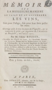 ROZIER (François). — Mémoire sur la meilleure manière de faire et de gouverner les vins, Soit pour l’usage, soit pour leur faire passer les mets. — Ouvrage utile à tous les pays de Vignoble, qui a remporté le prix, au jugement de...
