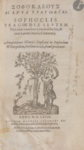 SOPHOCLE. — Stragœdiæ septem. — Unà cum omnibus Græcis scholiis, & cum Latinis Ioach. Camerarij. — [Genève] : Henri Estienne, 1568. — 2 parties en un volume in-4, 256 x 160 : (4 ff.), 451 pp. mal chiffrées 461, 242 pp., (1 f. blanc).