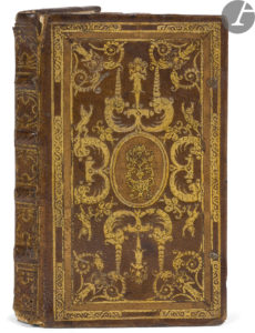Maroquin brun, plats ornés d’un riche décor de grotesques aux petits fers, composé au centre d’un médaillon de maroquin havane orné d’un motif doré, entouré d’un fer à têtes de griffon affrontées dont les corps se rejoignent pour former au centre un motif en forme d’enclume, de motifs de feuillage, de cariatides aux angles et au centre, ainsi que de quatre singes, le tout doré et encadré de filets dorés avec plaques de rinceaux entre deux, dos à nerfs orné, tranches dorées et ciselées (reliure de l’époque).