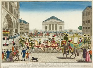 Arrivée de l'Empereur Napoléon le Grand à la Basilique de Notre-Dame de Paris, le 15 Août 1807. Paris, Chereau, s.d. 29 x 41 cm, encadrement de baguettes de bois doré et noir.