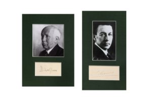MUSIQUE 2 signatures autographes montées avec des photographies ; sous passe-partout percaline verte.