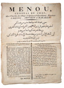IMPRIMERIE NATIONALE DU CAIRE. – MENOU (Jacques-François de Boussay de) — Menou, général en chef, aux Cheykhs du village el-Qaouet el-Qouddamy, province d’Attfyèhhly, Abouket et Baraket.