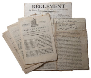 la réorganisation de l’impôt sur le sel. – Menou (Jacques-François de Boussay de). Copie de l’ordre du général en chef, inséré dans l’ordre du jour du 7 vendémiaire an 9 [29 septembre 1800]. Au Kaire, de l’Imprimerie nationale, [1800]. Bifeuillet petit in-folio. Concernant la réorganisation des droits de navigation sur le Nil. – Menou (Jacques-François de Boussay de). Copie de l’ordre du général en chef, inséré dans l’ordre du jour du 20 vendémiaire an 9 [12 octobre 1800]. S.l.n.n., [1800]. Plaquette petit in-folio, (5) ff. Concernant l’instauration de taxes sur les corporations d’artisans, d’ouvriers et de marchands. – Menou (Jacques-François de Boussay de). Copie de l’ordre du général en chef, inséré dans l’ordre du jour du 20 vendémiaire an 9 [12 octobre 1800]. S.l.n.n., [1800]. Plaquette petit in-folio, (3) ff., en feuilles. Concernant l’instauration d’un impôt personnel annuel sur « les nations copte, syrienne et damasquine, grecque, juive, et tous les individus qui, quoique de différentes nations européennes, forment en Égypte un corps connu sous le nom de francs ». – Menou (Jacques-François de Boussay de). Copie de l’ordre du général en chef, inséré dans l’ordre du jour, du 16 brumaire an 9 [7 novembre 1800]. Au Kaire, de l’Imprimerie nationale, [1800]. Affiche petit in-folio. Concernant les abus et vexations exercés sur les contribuables par les fermiers des droits fiscaux.