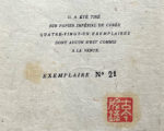 Édition originale, hors commerce, un des 81 exemplaires numérotés sur papier impérial de Corée, le n° 21, parmi les 21 exemplaires de tête sur papier plus épais. 2 sceaux ont été appliqués à la main, au cinabre, « 古今碑録 » et «  秘 園 之 印  », sans le troisième figurant habituellement en fin de volume. 3 sceaux ont été appliqués à la main, au cinabre. Sur le détail du tirage, et sur les sceaux, cf. supra le n° 68. Exemplaire réservé par Victor Segalen à sa fille Annie (mention autographe de l'écrivain, « Annie », sur un feuillet de papier Morin joint au volume). Cet exemplaire a été présenté dans l'exposition De Tahiti au Thibet ou les Escales et le butin du poète Victor Segalen, tenue à la librairie Jean Loize en 1944 (n° 36 du catalogue imprimé).