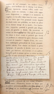 Texte quasiment complet, formé de 3 jeux différents complémentaires : la troisième partie (41 ff. non mis en page abondamment corrigés, au crayon et à l'encre noire) figure en un tirage primitif avec un « bon pour épreuves en pages » et l'indication d'une « peinture » à ajouter, ici non encore imprimée, « Maîtrise logique de Song ». Les 2 premières parties (63 ff., non mis en page, corrigés à l'encre rouge) correspondent à un tirage plus proche de l'intention définitive de Victor Segalen. Les 5 premiers et 5 derniers feuillets, corrigés en rouge et noir, sont mis en page. Ces placards furent travaillés par Victor Segalen en septembre 1915 puis au tournant de 1915 et 1916, comme nous l'apprennent une lettre qu'il a écrite à Jules de Gaultier le 4 septembre 1915, « J'ai tout aussitôt réouvert le manuscrit de Peintures. Nous en sommes aux premières épreuves, typographiées par les soins de Crès. », et trois lettres connues des éditions Crès, la première signée de Charles Grolleau le 27 décembre 1915 : « Nous vous adressons les premiers placards (49 feuillets) de Peintures [...]. Vous pourrez ainsi faire votre mise en pages ». Les deux autres de Georges Crès lui-même, le 11 janvier 1916 : « Nous envoyons vos épreuves avec addition de copie à l'imprimeur en le priant de mettre en pages. Nous répondrons dans le plus bref délai possible à vos diverses observations mais nous vous écrivons aujourd'hui pour vous informer qu'il ne nous sera pas possible de prendre à notre charges les nombreuses corrections d'auteur que vous faites sur les épreuves «, et le 21 février 1916, en lui renvoyant « le spécimen de mise en page que nous adresse l'imprimeur ». Victor Segalen a ici procédé au redécoupage du texte en chapitres et en paragraphes, avec indications de mise en page, mais également porté des corrections de fond et de forme sur son texte : il a choisi des mots plus en accord avec sa poétique, corrigeant par exemple « son goût inné pour le spectacle » en « son goût inné pour le tréteau » (p. 65). Il a plusieurs fois recherché une plus grande sobriété dans ses images, supprimant par exemple la redondance « et plein de bonne manières » dans la formule « le Visiteur cérémonieux et plein de bonnes manières » (p. 63), ou ne conservant que les trois premiers mots de l'expression « hantée de génies, bruissant des ailes qui s'y viennent poser » (p. 79). Il a fait par ailleurs un travail sur la sémantique, le rythme et la sonorité, corrigeant par exemple « C'est le château d'eau d'où viennent ses fleuves drainant les provinces » en « C'est le château d'eau d'où découlent les fleuves drainant ses provinces » puis en « C'est le château d'eau d'où les fleuves, drainant ses provinces, découlent » (p. 90). Il explicite aussi des passages trop allusifs : « L'autre flotterait non mois léger » est ainsi complété en « Et l'Autre, le Dragon, flotterait non moins léger » (p. 97). Il a relevé des coquilles, mais son attention à l'exactitude typographique s'étend jusqu'à l'alignement des lettres dans un même mot, ou à l'espacement entre les mots. Quelques variantes demeurent encore ici avec la version définitive publiée, où quelques expressions seraient reformulées, des titres intermédiaires ajoutés, et où la couverture se verrait ajouter la mention de la succursale de Zurich de Georges Crès qui ne figure pas ici. Une œuvre débutée dans la Chine prérévolutionnaire, achevée dans l'Europe en guerre. En 1910 et 1911, Victor Segalen rédigea en Chine des notes pour Le Fils du ciel, formant 4 cahiers achevés le 21 décembre 1911. En 1912 et 1913, il reprit la partie de ce travail relative à la peinture chinoise ancienne pour en faire un texte destiné à la « Collection coréenne » qu'il dirigeait pour l'éditeur Georges Crès. Il établit ainsi un second manuscrit qu'il reprit encore à partir de février 1915 alors que, rentré en Europe, il envisageait une édition courante préalable à une édition de luxe dans la Collection coréenne (lettre à Jean Lartigue du 4 février 1915). Le 19 mai 1915, il écrivit à Jean Fernet : « Au moment de venir ici [sur la ligne de front], je mettais juste le point final au 2e manuscrit, dans "l'écriture" que vous connaissez, de Peintures, et j'entamais sous sa forme définitive, le troisième. » Les premières épreuves de l'édition courante furent imprimées en septembre 1915, et, excluant la proposition faite par Georges Crès d'une forme chinoise, par crainte d'inauthenticité dans le travail des imprimeurs français, Victor Segalen opta pour une présentation servie par « la plus pure présentation typographique ». Il ajouta simplement l'ornement de deux sceaux au cinabre en tête et à la justification « formant "portique" ».