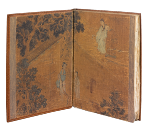 In-8, (8 dont les 2 premières blanches)-207-(9 dont les 3 dernières blanches) pp., exemplaire à toutes marges (240 x 168 mm), maroquin tabac, dos à nerfs avec initiales « Y.V.S. », peinture chinoise sur soie appliquée sur le premier contreplat et le recto de la garde supérieure, autres gardes de papier de Corée, tête dorée sur témoins, couvertures conservées, chemise à dos à nerfs de maroquin marron avec initiales « Y.V.S. » dorées en queue ; auréole peu marquée affectant le dos et le plat inférieur, étui manquant (René Kieffer).