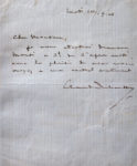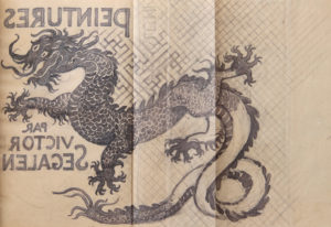 Édition originale, un des 18 exemplaires sur grand papier de tribut coréen, seul grand papier. 3 sceaux appliqués au cinabre à la main, au titre, à la justification et p. 207. Ils ne sont qu'imprimés dans les exemplaires du tirage courant (cf. supra le n° 73). Exemplaire nominatif « imprimé pour Claude Debussy ». Sur les rapports entre Victor Segalen et Claude Debussy, cf. supra le n° 69. Enrichi de 3 pièces : – Segalen (Victor). Télégramme à Charles Bargone dit Claude Farrère. Paris, 24 avril 1906. « Pouvez-vous me télégraphier un mot d'introduction pour [Pierre] Louÿs par lequel je tenterai [de] parvenir chez [Claude] Debussy, seul recours... » – Debussy (Claude). Lettre autographe signée à Victor Segalen. Paris, 10 septembre 1906. « Cher Monsieur, je vous attendrai demain mardi à 3h. de l'après-midi avec le plaisir de vous revoir. Croyez à mon cordial sentiment... » – [Monfreid (Georges-Daniel de)]. Dessin original, mine de plomb et encre noire, 19,5 x 24,5 cm. Projet de couverture par le peintre, pour l'ouvrage Peintures de Victor Segalen, librement inspiré d'un motif de soierie chinoise ancienne ayant appartenu à Victor Segalen, soierie ornant actuellement les première et dernière gardes volantes l'exemplaire de René Leys relié par Paul Bonet décrit ci-après sous le n° 8. Non retenu pour Peintures, ce projet fut ensuite employé en 1922 pour l'édition originale de René Leys de Victor Segalen, comme modèle de la gravure sur bois de la couverture. Sur l'amitié de George-Daniel de Monfreid avec Victor Segalen, cf. infra le n° 79. Une note au recto de la garde inférieure indique : « Reliure "abstraite de Jean Loize et Jacques Fouquet, ce dernier ayant décoré les papiers des plats spécialement pour cet exemplaire. Exécution : atelier Devauchelle 1955. » Écrivain et libraire, Jean Loize avait organisé en 1944 une exposition intitulée De Tahiti au Thibet ou les Escales et le butin du poète Victor Segalen.