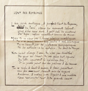 Le chant ouvrant son recueil Odes, publié de manière posthume aux éditions Les Arts du livre en 1926 « Lève, voix antique, & profond Vent des Royaumes, Relent du Passé, odeur des moments défunts. Long écho sans mur, & goût salé des embruns Des âges ; reflux assaillant comme les Huns. Mais tu ne viens pas de leurs plaines maléfiques : Tu n'es point comme eux poudré de sable & de briques Tu ne descends pas des plateaux géographiques Ni des ailleurs : – des autrefois, du fonds du Temps. [...] Viens ressusciter tout de ta grande caresse » « Cette inoubliable et torrentielle impression du Passé ». Victor Segalen emprunte le titre de cette ode à celui de la première partie du Livre des vers (詩經, Cheu-King, ou Shijing), la première anthologie poétique de l'histoire littéraire chinoise, qu'il a étudiée dans l'édition établie par Séraphin Couvreur publiée en 1896 (Chou-King : Les Annales de la Chine, édition trilingue chinoise, française et latin, Ho Kien Fou, imprimerie de la mission catholique). Cette partie correspond aux poèmes les plus anciens, ceux de la période de la dynastie Tchéou (Zhou) (xiie-iiie siècles avant Jésus-Christ). La formule, qui signifie littéralement « vent des royaumes » (國風, « kouô foung », « guofeng »), autorise une grande richesse d'interprétations. Séraphin Couvreur en livre deux classiques : « Maô Tch'âng en donne l'explication suivante [...], "Foung, vent, enseignement. Ces chants sont comme un souffle qui remue les âmes ; ils contiennent des enseignements qui transforment les cœurs." [...] Tchôu Hi dit : "國, kouô, domaine soumis à la juridiction des princes [...] ; 風 foung, stances que le peuple avait coutume de chanter. Les chants populaires sont appelés foung parce qu'ils ont été composés sous l'influence des grands, et sont capables de faire impression sur les esprits ; de même qu'un objet rend un son sous l'action du vent, et que ce son est capable d'agir sur d'autres objets ». Victor Segalen en a proposé son propre commentaire, publié en regard du poème dans le recueil : « Le Poète entend sans doute ici par "Vent des Royaumes" [...] cette inoubliable et torrentielle impression du Passé, envahissant parfois en triomphe le Présent, "l'abominable présent cadavérique", ainsi qu'il est dit ailleurs. Ce vent est bien le souffle du Passé. Ce vent n'est pas le "Jaune" qui dévale des Steppes mongoles (d'où cette allusion historique des Huns). Il n'apporte point la poussière, ni la tempête, ni la pluie, – mais plénitude. Il se suffit de lui-même. Tout le goût du Passé se concrète un jour, une heure, un moment. Alors l'antiquité déborde et l'instant crève. La vie même, la très précieuse et très affairée vie, se suspend à son passage. On n'espère plus ; on ne désire plus ; on ne peut crier de joie : mais, de toutes les bouches de l'esprit on aspire et l'on gonfle de lui. Cette ode au Passé ne peut donc être ancienne : il faut bien qu'elle date d'aujourd'hui. » Rimes et rythmes à la chinoise. Selon le principe indiqué dans sa lettre du 26 janvier 1913 à Jules de Gautier, la présente ode est comme les autres du recueil « un poème court, conçu sur des rythmes chinois : 5 + 7 ». Elle répond par ailleurs à un système de rimes chinois : quatre vers de trois rimes plates encadrées par deux autres rimes croisées aux extrémités des 2 premiers quatrains et à la charnière des deux suivants, soit : abbb cccd / eeea dfff. Séraphin Couvreur évoque ce système dans son introduction générale au Cheu King : « Dans une même strophe, tantôt les vers se terminent tous par le même son, tantôt la rime varie. Le plus souvent les vers qui riment ensemble se suivent immédiatement ; mais on rencontre aussi des rimes croisées. Quelquefois le premier ou le dernier vers d'une strophe rime avec le premier ou le dernier vers de la suivante. » Victor Segalen, Œuvres, Paris, Gallimard, Nrf, Bibliothèque de la Pléiade, vol. I, p. 850.