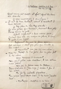 9 « séquences » de Thibet. Rarissime en mains privées, le manuscrit et le dossier de travail autographes étant conservés à la BnF. Ce manuscrit déposé en bibliothèque comprend plusieurs versions de chaque poème, avec variantes, et les présentes « séquences » sont parfois conformes aux versions publiées dans la Pléiade d'après le manuscrit de la BnF, parfois légèrement différentes. Certaines sont inachevées. Victor Segalen a utilisé ici, comme souvent pour ses manuscrits littéraires et sa correspondance, un papier calque légèrement sulfurisé, fabriqué par les établissements Morin, qu'il appelait parfois « papier d'architecte ». iiie « séquence », ici sans date. « Même si je meurs plongeur à la mer saumâtre mauvaise au goût, Ou nageur à plat dessus la plaine, Ou de mort tiède étalé dans l'immobile lit trop doux, Je n'omettrai point de mon haleine Ardente – cri de rappel – le souvenir à voix d'airain De ton premier geste souverain. Thibet, d'un bond tu m'apparus, le monde changé, – vierge énorme Au delà des monts de mon désir ; Épaulant le Ciel-Océan de ton promontoire sans norme, Radjah du gigantesque gésir [...] » ve « séquence », sans date. « Sois loué, Thibet inhumain, pour ce front masqué de glaciers ; (Je n'y vois d'insolites visages...) – marmonnants mufles de mes yaks, chanfreins de mes chevaux d'acier, – (Je n'y vois d'insolites visages...) Pour ton blason sans traits ni teint ; pour ta figure d'un seul plan [corrigé dans une version ultérieure en « ta figure d'icoglan »]. Je n'y vois d'insolites visages : Je veux dire : vision, soudain, de cette Autre, de l'autre clan [corrigé dans une version ultérieure en « vision soudaine d'un Être de l'autre clan »] D'Elles, en leurs magiques mirages, Larves douces d'épouvante ou fantômes prestigieux [corrigé dans une version ultérieure en « Larves douces douloureuses plus que tout remords vicieux »] [...] vie « séquence », ici datée « Singapore 22 déc. 17 / Brest 25 avril 18 », dans un texte inachevé. Victor Segalen y a laissé le choix de 10 mots en suspens : 7 en blanc dont 3 pour lesquels il a indiqué le rythme recherché au moyen de signes de scansion gréco-latins (« ⋃ » pour un pied court, « — » pour un pied long). Il a complété par la suite deux de ces blancs scandés, et marqué en outre 3 mots entre crochets comme incertains. Victor Segalen a emprunté pour cette « séquence » la vision du lama et des yaks gelés à un passage de l'ouvrage d'Évariste-régis Huc, Souvenirs d'un voyage dans la Tartarie, le Thibet et la Chine (Paris, Adrien Le Clère, 1850). « Par le voyage de la vie en caravane personnelle Exploratrice du temps blanc [...] Il y a ces os laissés en pâture aux ... Dans une extase sempiternelle [...] Mais plus épouvantable de morne, J'ai regardé de tous mes yeux trop souffrants d'un rude soupçon Un moine gelé, bloc [le mot « bloc » est ici inscrit entre crochets] irascible, Abandonné par ses ⋃ — [ajout :« conjoints »] avant l'agonie impossible : J'ai vu l'homme vif pris au glaçon ! » viiie « séquence », ici signée de son monogramme et datée « 28 août/1r sept./4 sept. 18 », avec une épigraphe non conservée par la suite, « "La Montagne, sculpture de la Terre...", Cap-Coz. Juil. 18. H. », sans doute là une citation de son amie Hélène Hilpert. « Quel homme eût sculpté cet effort ? Quel être-dieu eût ébauché Ce corps innombrable & sans-figure ? [...] – Mais toi, Thibet, tu t'es pétri, levé du plus fort de toi-même, Héros terrassier & émouvant : Non point potier mis créateur [créateur corrigé en « poète » dans la version imprimée] ; & non artisan mais poëme Non pas du dehors mais du dedans ; Dieu-statuaire & dieu surgi, ciseau & feu & roc ardent, Tu fis ta médaille planétaire, Ton propre grand'œuvre dressé à ta devise escaladant : "Montagnes, sculpture de la Terre." » xxe « séquence », ici intitulée « Tö-Bod. Séquence dixième » et datée « 16 oct. 18 ». Un mot laissé en blanc mais avec indication du rythme voulu, et deux ratures. « En vain ! en vain ! et j'en suis là : seul & Toi devant ton spectacle, Ce lieu fixé dru par le regard. Pour te tenir ainsi, Thibet, au plus haut de tes simulacres [...] – Et voici... le Moment est haut & je la tiens pour bien acquise, Amoureuse à pleurer de plaisir. Je suis le possesseur humain d'un dieu-fait-Ève la conquise, ( – – ) incarnée à mon désir. Que l'heure soit. Vienne l'instant. Tombe la cime d'allégresse, Et crève le cri de profondeur. Un autre monde thibétain jaillit du volcan de caresses [... ] » xxie « séquence », ici datée « 17 avril / 26 avril 1918 » : « Où est le sol, où est le site, où est le lieu, – le milieu, Où est le pays promis à l'homme ? Le voyageur voyage & va... Le voyant le tient sous ses yeux. Où est l'innomé que l'on dénomme : Népémakö dans le Poyoul, & Padma-Skod, Knas-Padma-Bskor [noms hindous et tibétains d'une « terre promise » qui était réputée se trouver dans la partie sud-ouest du Tibet] Aux rudes syllabes agrégées ! [...] » xxiiie « séquence », ici intitulée « Lha-Ssa. Séquence seconde » et datée « 21 oct. 18 », avec un mot laissé dans l'indécision et deux ratures : « Me revêtir de ton architecture : devenir l'un de tes vaisseaux... (Jadis j'habitai des cathédrales, Priant de plaisir ou de pleurs, endossant la voûte en berceaux, Verrier des lumières abyssales, Je me faisais le grand [« grand » avec « bon » suscrit] logis recouvrant la foule en ferveur, J'étais Notre-Dame-des-Rumeurs.) – Thibet pieux, médiéval, ô jaillissant de la prière, Pays qui se renverse en arrière Ainsi qu'un regard révulsé ou des sourcils peints à rehaut [...] » xxvie « séquence », ici intitulée « Lha-Ssa. Séquence huitième » et datée « 28 oct. [1918] », dans un texte demeuré inachevé des 6 derniers vers et demie : « Nuit