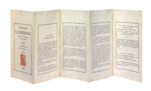 Belle impression sur vergé feutré de Corée. Un texte majeur de la bibliophilie occidentale. Segalen avait écrit en 1912 un long texte destiné à expliciter ses choix bibliophiliques pour l'édition originale de Stèles, en matière de papier, format, pliage, illustration : « il s'agit simplement de l'adaptation au Livre occidental des principes bibliophiliques établis depuis cinq ou six cents ans par les Calligraphes et Maîtres-Imprimeurs dans l'Empire du Milieu ». En fait, c'est en 1914 seulement, sous le titre Aux lettrés d'Extrême-Occident, qu'il en publia la partie centrale et principale, d'abord dans le présent « manifeste » de sa Collection coréenne puis dans l'édition de 1914 de Stèles de cette collection.
