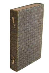 Collection coréenne composée sous la direction de Victor Segalen à Péking pour Georges Crès & Cie [...] à Paris, 1914. [À la fin du second volume :] Des presses du Pei-T'ang, 1914. 2 volumes de format 288 x 178 mm, imprimés, pliés et cousus à la chinoise, en foliotation continue : (3)-87 ff. Le tout est placé dans un portefeuille cartonné à double rabat (dit « t'ao »), recouvert de soie brochée à motifs géométriques polychromes répétés, et doublé de vergé coréen, avec deux fermoirs d'os et de soie brochée ; portefeuille usagé avec dos passés, coupes et mors frottés (portefeuille d'origine).