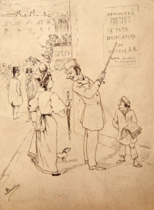À un « cher ami ». S.d. Invitation à un repas : « ... La plus franche cordialité ne cessera de présider à ces agapes... » (une marge avec plis et fentes). — Au « cher docteur » David Pelet. S.d. « Veux-tu me faire envoyer mon courrier à Honfleur (cette adresse suffit). Toi, quand tu m'écris, au cas où tu aurais des histoires d'accouchement à me raconter, écris-moi Café de Paris... Nous serons installés le 15 juillet dans la splendide Villa des Roches. Il y aura une mansarde pour toi. Écris-moi de temps en temps pour me tenir au courant du mouvement parisien... À part ça, rien de neuf ici. L'orage sévit terriblement. Je serre ta main de vieux praticien... » Personnage étonnant, David Pelet fut un temps publiciste et administrateur du Théâtre du Chat noir, et devint l'agent d'Alphonse Allais lorsque celui-ci séjournait en province. — [Au ministre de l'Intérieur, Pierre Waldeck-Rousseau]. « Villa Baudelaire » à Honfleur, 1901. « Si, entre deux distributions de fusils aux mineurs [Waldeck-Rousseau avait fait donner la troupe à Monceaux-lès-Mines lors de la grève des mineurs en janvier 1901], il vous était loisible de jeter un coup d'œil favorable sur la présente sollicitation, je vous en saurais le plus vif gré cependant que mon dévouement à la cause républicaine en recevrait une ardeur nouvelle... » (coupure centrale restaurée). — À l'écrivain Lucien Descaves. [1893]. S.d. « Croyez-vous pas... que ce serait une occasion de me traduire devant votre tribunal [l'Académie Goncourt] ? (Rapport à mon récent bouquin Pas de bile !) Comme antécédents, des plus déplorables, À se tordre et Vive la vie !... » — Joint : Bocardho (J.). Deux dessins originaux signés avec poème autographe signé dédié à Alphonse Allais. Encre et plume aux recto et verso d'un bristol in-16. Au recto, une farandole de fêtards encadre le poème qui joue phonétiquement sur le nom Allais, et au verso, une scène de rue avec affiche publicitaire « Demandez partout la pâte désopilatoire du docteur A. A. »