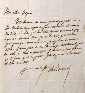 Lettre autographe signée au baron Isidore Taylor, commissaire royal du Théâtre-Français, avec apostille autographe signée de celui-ci. 1828. Il demande de l'argent pour son logement, à rembourser sur les premiers revenus de sa pièce Henry III et sa Cour, qui serait créée au Français en février 1829 (déchirure restaurée au feuillet d'adresse). — Lettre autographe signée à monsieur Arpin, professeur d'histoire à Blois. [Vers 1840-1844]. Il évoque notamment son épouse la comédienne Ida Ferrier. — Lettre autographe signée. [Entre 1847 et 1850]. Concernant le Théâtre-Historique qu'il avait fondé et dirigeait alors : il demande le concours de son correspondant pour une représentation. — 2 pièces autographes signées à Xavier de Lasalle et son associé Mélan, éditeurs parisiens du périodique El Correo de ultramar à destination de l'Amérique hispanophone. 1865 et 1866. Concernant la cession de ses droits pour la traduction espagnole de son roman Le Comte de Moret [Le Sphinx rouge] : « La propriété exclusive en langues espagnoles est accordée pour Paris... Il est convenu que je vous cède le droit de publication du Comte de Moret dans tous les pays de la langue espagnole exceptée l'Espagne. J'ai reçu aujourd'hui le prix du 1er volume... (1865). « Reçu de Messieurs La Salle et Melan la somme de deux cent cinquante francs pour le 4e volume qu'ils peuvent terminer à la prise de Pignerolle – les deux autres volumes, selon nos conventions, leur seront donnés par moi pour rien... » (1866). Le Comte de Moret parut originellement dans le périodique Les Nouvelles en 1865 et 1866. Il ne paraîtrait pas en librairie du vivant de l'auteur, et serait réédité au XXe siècle sous le titre Le Sphinx rouge. Joint : Saint-Félix (Félix d'Amoreux, dit Jules de). Lettre autographe signée à Alexandre Dumas père. 1856. Son fils devant voyager en Australie, Saint-Félix dit avoir besoin d'argent et souhaite pour cela publier en librairie un livre qu'il avait fait paraître auparavant dans Le Mousquetaire, journal d'Alexandre Dumas. Il demande donc à celui-ci de bien vouloir céder ses droits à un éditeur.