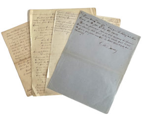 Manuscrit autographe. 1 f. in-folio. Version primitive d'un passage des Nouvelles impressions de voyage. Midi de la France (1841). S'arrêtant à Roquemaure (au nord d'Avignon), il narre ici l'histoire d'Annibal, qui y passa en chemin pour sa campagne contre Rome. — Manuscrit autographe. 1 f. in-folio. Version primitive d'un passage des Mémoires de Garibaldi (1860). 1/4 p. in-folio. Ici à la troisième personne, elle serait développée à la première personne à la fin du chapitre XIV du deuxième volume, et relate un moment du siège de Rome soutenu contre les Français du général Oudinot (1849) en évoquant la haute figure de son chapelain Ugo Bassi. — Manuscrit autographe. 1 f. in-4. Notes préparatoires aux Mémoires de Garibaldi (1860). 1 p. in-folio. Sur le général Carlo Filangieri, au service de Ferdinand II, sur les combats en Sicile en 1848, et sur une entrevue de Garibaldi avec le roi. Au verso, notes d'une autre main, liste de personnalités italiennes dont « Filangieri et sa femme ». — 6 fragments de manuscrits (3 autographes signés dont 2 de ses initiales, et 3 autographes). Destinés au journal L'Indipendente qu'il avait fondé à Naples en soutien à Garibaldi. [Entre 1860 et 1864]. « Vous avez pour vous les meurtriers, les assassins, les incendiaires – ... les fra Diavolo, les Chiavone, les Ninco Nanco, les Pilone, les Tamburrino. Nous avons pour nous les martyrs – les Pimentel, les Pagano, les Conforti... ». Etc. — Joint : Dumas père. Article imprimé intitulé « 4 août », dans le supplément au journal Le Siècle du 15 novembre 1842. Sur la mort du duc d'Orléans.