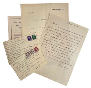 À l'écrivain Maurice Sachs. « 16 juillet ». « Votre lettre me touche beaucoup et j'aurais bien voulu vous revoir, moi aussi, mais la vie à Paris me devient de plus en plus pénible et j'ai avancé de quelques jours la date de mon départ, si proche déjà. Je serai donc très bousculé toute cette fin de semaine mais compte beaucoup sur le grand plaisir de vous revoir à mon retour. Merci encore. Votre ami... » — À Georges Poupet, éditeur chez Plon. Florence, 1935. « Mon voyage s'achève... Nous sommes allés un peu partout de Gênes à Palerme (et vous aussi sans doute, dans les limites du Petit-Palais [où se tenait alors l'exposition L'Art italien de Cimabue à Tiepolo]). Il fait une chaleur horrible à Florence mais cela ne parvient pas à gâter un séjour délicieux... » Au recto, une vue photographique du palais Pitti. — À un membre du Pen Club. 1949. Pour refuser une invitation, par manque de temps. — Au libraire-éditeur Max-Philippe Delatte (librairie Ronald Davis). Copenhague, 1950. « Je vous serais très obligé de vouloir bien mettre de côté jusqu'à mon retour ce nouveau volume de [Léon] Bloy... » Au recto, une vue photographique de la Rådhuspladsen à Copenhague. — À un « cher Monsieur ». 1958. « ... Vous avez parlé de mon livre [Le Bel aujourd'hui. 1955-1958, septième partie de son Journal] d'une manière qui m'a profondément touché. Vous pensez bien que ce n'est pas sans hésitation qu'on publie un ouvrage de ce genre où l'on essaie de dire le plus possible ce qui peut être dit. Ce sont les omissions qui coûtent le plus. Le lecteur ne le sait jamais. Et puis, l'auteur ne se rend pas bien compte de l'effet que produisent des phrases qui sont à mi-chemin entre la confidence et la confession. Mais vous avez su dégager l'essentiel et vous avez vu, mieux que moi sans doute, ce qui'il y a au fond de ce livre, car on ne se connaît pas soi-même. Je vous sais gré d'avoir attiré sur ce journal l'attention de certains lecteurs que je voudrais atteindre et qui me liront, peut-être, grâce à vous. Non que j'accorde à ces pages plus d'importance qu'elles n'en méritent, mais enfin, si mon journal est, comme je crois l'avoir dit, une sorte de lettre, il est légitime de désirer qu'elle parvienne à son destinataire !... » — Joint, le prospectus imprimé de son livre Mille chemins ouverts, second tome de ses mémoires, paru chez Bernard Grasset en 1964.