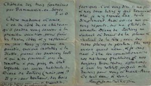 « C'est du côté de ce château qu'il faudra vous sauver à la première occasion pour fuir les tristes idées & y refleurir en joie. Nous y sommes au paradis, quoique installés à la diable, parmi des ouvriers lents & qui n'en finissent pas de remettre à peu près en état logeable cet ancien habitacle de Diane de Poitiers (mais, oui !). Il y a, par bonheur, des bois féeriques. C'est vous dire si ma fée & mes deux lutins y sont heureux ! Moi, je m'y trouve Pan, tout simplement. Aussi est-ce moi qui vous réponds, sur ma flûte... »