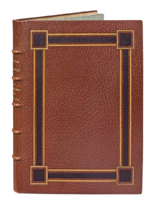 Paris, Édouard, Pelletan, 1902. In-4, maroquin rouille, encadrement de bandes de maroquin en trois tons, serties à froid, cadre de maroquin intérieur orné d'un listel à froid avec motifs d'angles mosaïqués, doublure et gardes de moire verte, tranches dorées sur témoins, couverture, étui (Marius Michel).