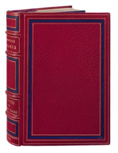 Paris, F. Ferroud, 1925. In-4, maroquin rouge, listel bleu mosaïqué encadré de filets dorés sur les plats, dos orné de même, multiples filets dorés intérieurs, doublure et gardes de moire bleue, doubles gardes, tranches dorées, couverture et dos, étui (Robert Blaizot).