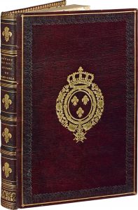 centre, dos orné de fleurs de lis dorées, chaînette sur les coupes, roulette intérieure dorée, tranches dorées (Bibolet).