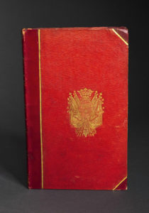 Grand in-8 (215 x 125mm). Marque typographique sur la page de titre. RELIURE DE L’ÉPOQUE. Dos de maroquin rouge à coins, armes royales au centre des plats, filets dorés, dos à nerfs orné et doré, tranches marbrées.