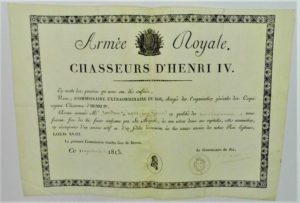 12 - ARMÉE ROYALE. CHASSEURS D'HENRI IV. Beau certificat gravé sur vélin (40 x 28,5 cm), décor de palmettes, médaillon en bas au centre représentant Henri IV de profil, petite vignette en tête. Nomination donnée le 22 juin 1815 (4 jours après Waterloo) signée de sa main par Jérôme Delandine de SAINT-ESPRIT (1787-1855), en faveur de Jean-Baptiste-Jordan Dugas, au grade de Sous-Lieutenant, "nous faisons fort de lui faire confirmer par Sa Majesté, à son retour dans sa Capitale, cette nomination, en récompense d'un service actif et d'un fidèle dévouement à la cause sacrée de notre Roi légitime Louis XVIII". Jérôme Delandine de Saint-Esprit fut à l'initiative durant les Cent-Jours, de recruter des volontaires, appelés "Chasseurs d'Henri IV", pour combattre "L’Usurpateur" (Napoléon 1er )