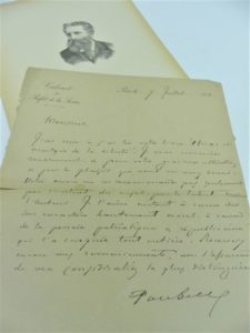 25 - Eugène POUBELLE (1831-1907), le célèbre Préfet de la Seine qui laissa son nom aux récipients à ordures qu’il imposa pour l’hygiène de Paris. Lettre autographe signée, 1 p in-4 (état moyen), 7 juillet 1888, à Albert Montheuil, qu’il remercie de l’envoi de son livre « Héros et martyrs de la Liberté » : « Je l’aime surtout à cause de son caractère hautement moral, à cause de la pensée patriotique & républicaine qui l’a inspirée tout entière ». Joint : tiré-à-part de l’encart de l’album Mariani