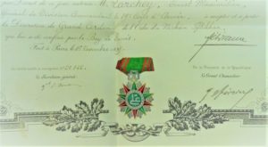 32 – DÉCORATION MILITAIRE. TUNISIE. Ordre du NICHAN IFTIKAR. Diplôme de GRAND CORDON décerné le 7 mai 1897 par Ali Pacha Bey au Général Ernest-Maximilien LARCHEY (Strasbourg 1834-1924), lettre de nomination jointe (diplôme 36 x 40 cm). Joint : le Diplôme de la Grande Chancellerie de la Légion d’Honneur gérante des ordres étrangers, donnant l’autorisation au Général Larchey, à accepter et porter cette décoration tunisienne, établi le 16 novembre 1895, signé par le Président Félix Faure (griffe). La décoration a été peinte à même le diplôme (48,5 x 38,5 cm)